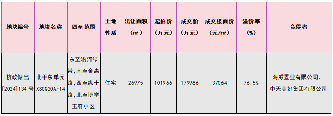 該地塊東至沿河綠帶,南至金惠路,西至縱十路,北至博學(xué)玉府小區(qū),出讓面積26975平方米(40.4625畝),1.0≤容積率≤1.8。地塊起始價101966萬元,開拍僅30分鐘,溢價率上升至55%。經(jīng)過70輪競價,最終由海威置業(yè)有限公司、中天美好集團(tuán)有限公司以179966萬元總價競得,成交樓面價37064元/㎡,溢價率76.5%(溢價率不僅為今年最高,更創(chuàng)杭州市區(qū)7年來溢價率新高)。
